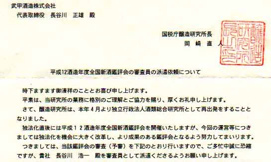 武甲酒造の専務 長谷川浩一が、平成12酒造年度の全国新酒鑑評会の審査員に選任されました。
